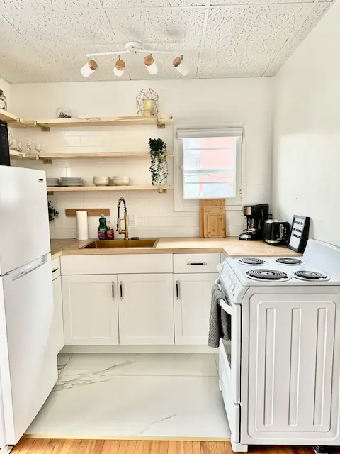 Kitchen: The updated layout has made a world of difference. The addition of open shelving creates an openness and contemporary yet functional cooking space that’s ideal for short-term guests.
