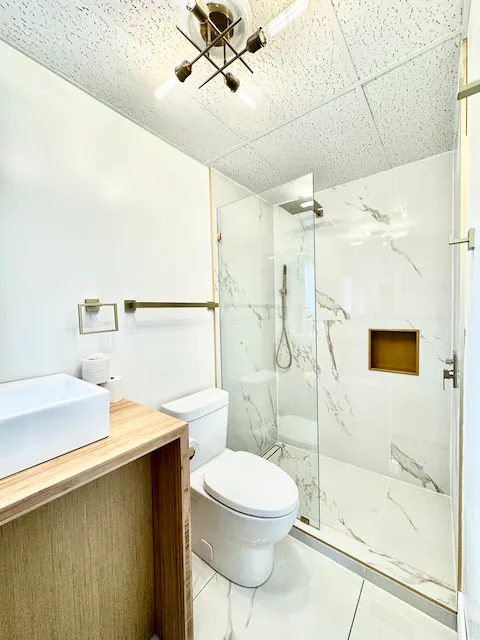 Bathroom: The bathroom finishes are modern and sleek. Large marble tiles, gold fixtures, glass shower door and a beautiful rain showerhead. After Photos:
